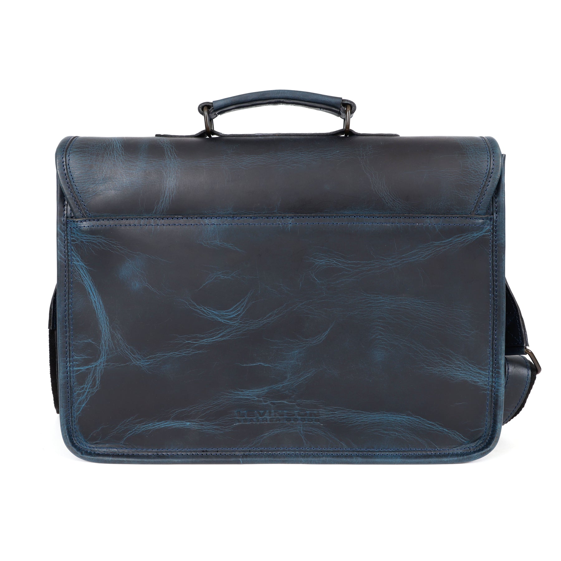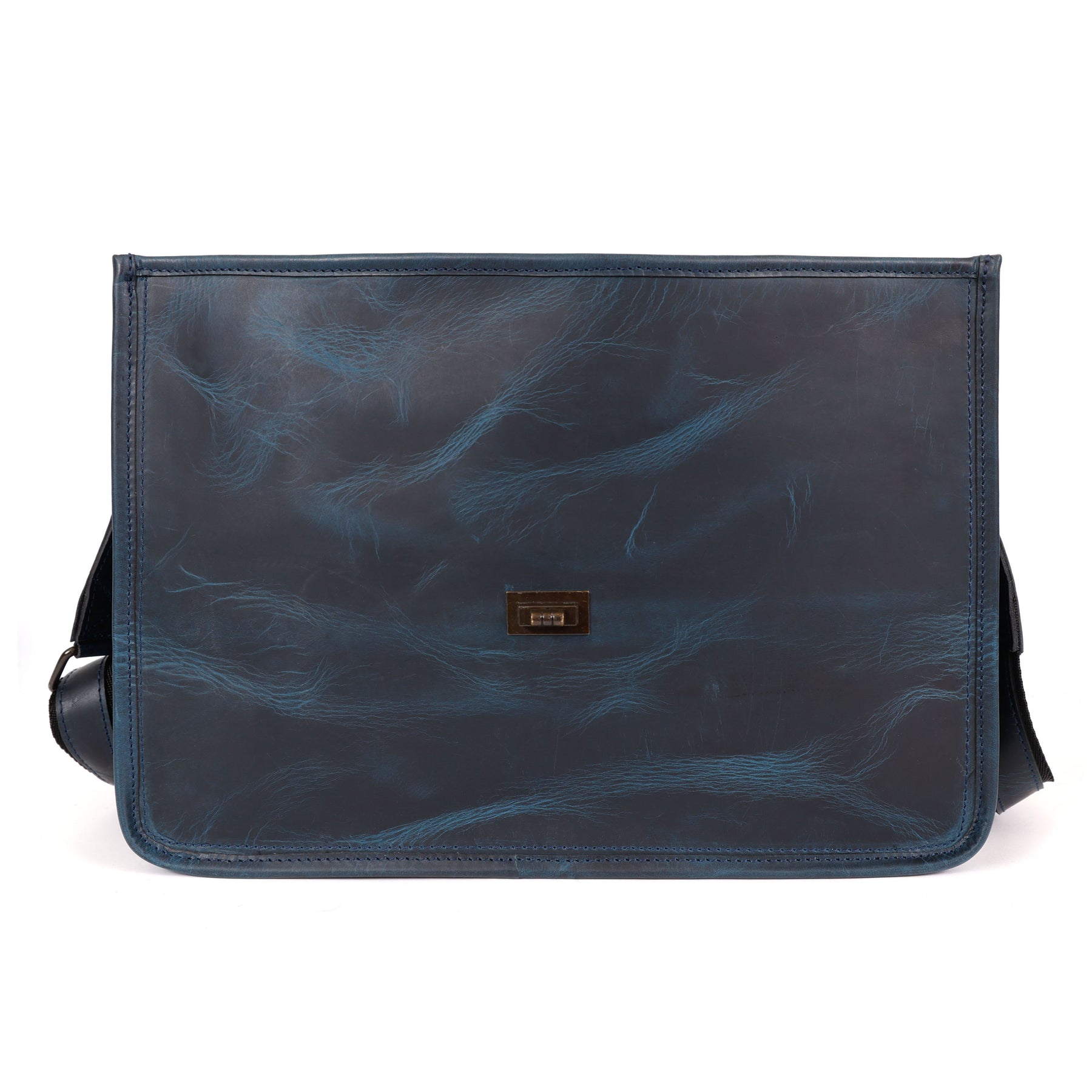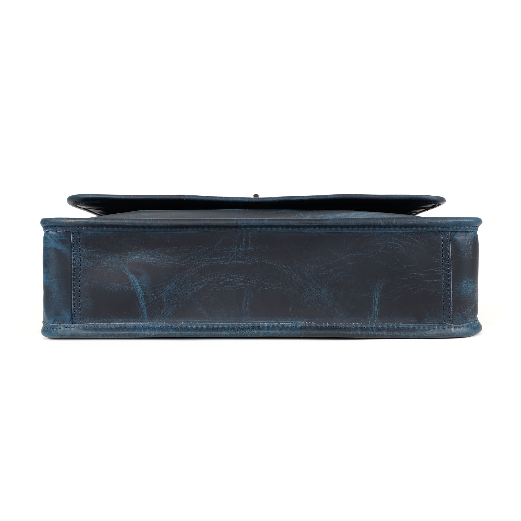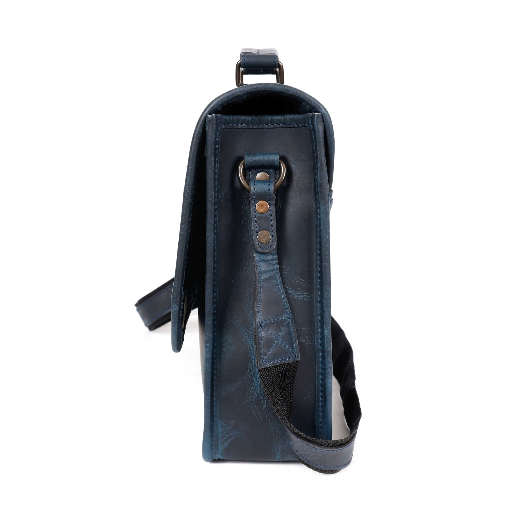 The Parker blue messenger bag showcases authentic full grain water buffalo leather in a rich blue finish. Each piece displays natural variations in tone and texture, a hallmark of genuine leather that ensures no two bags are identical. These subtle differences enhance the bag's character, revealing the material's organic beauty and craftsmanship while developing a distinctive patina with age.