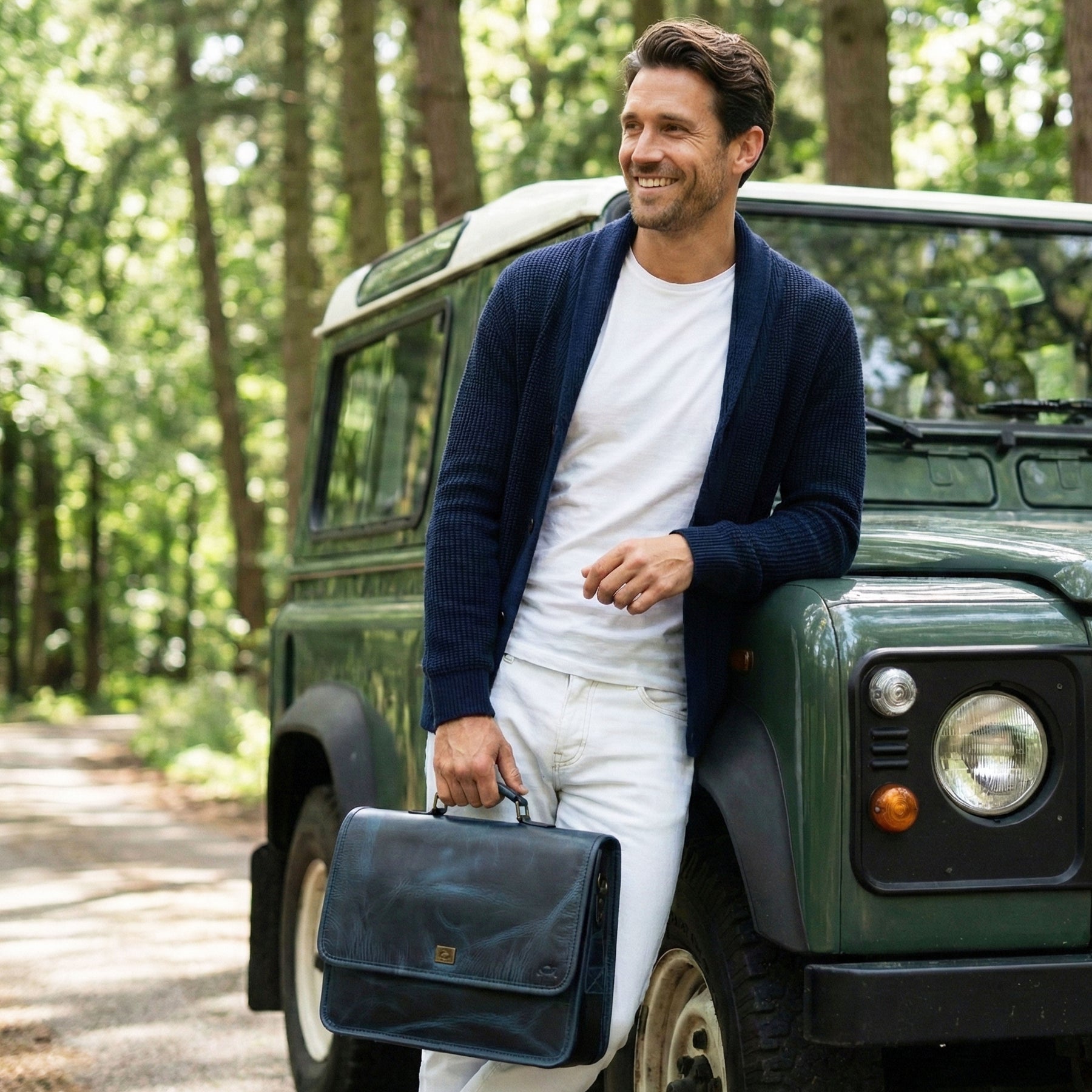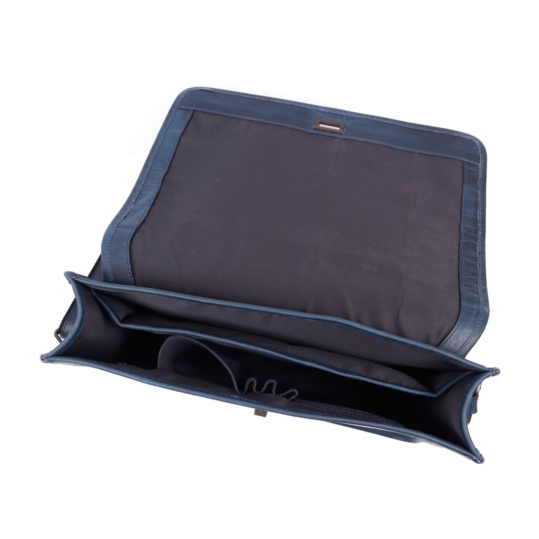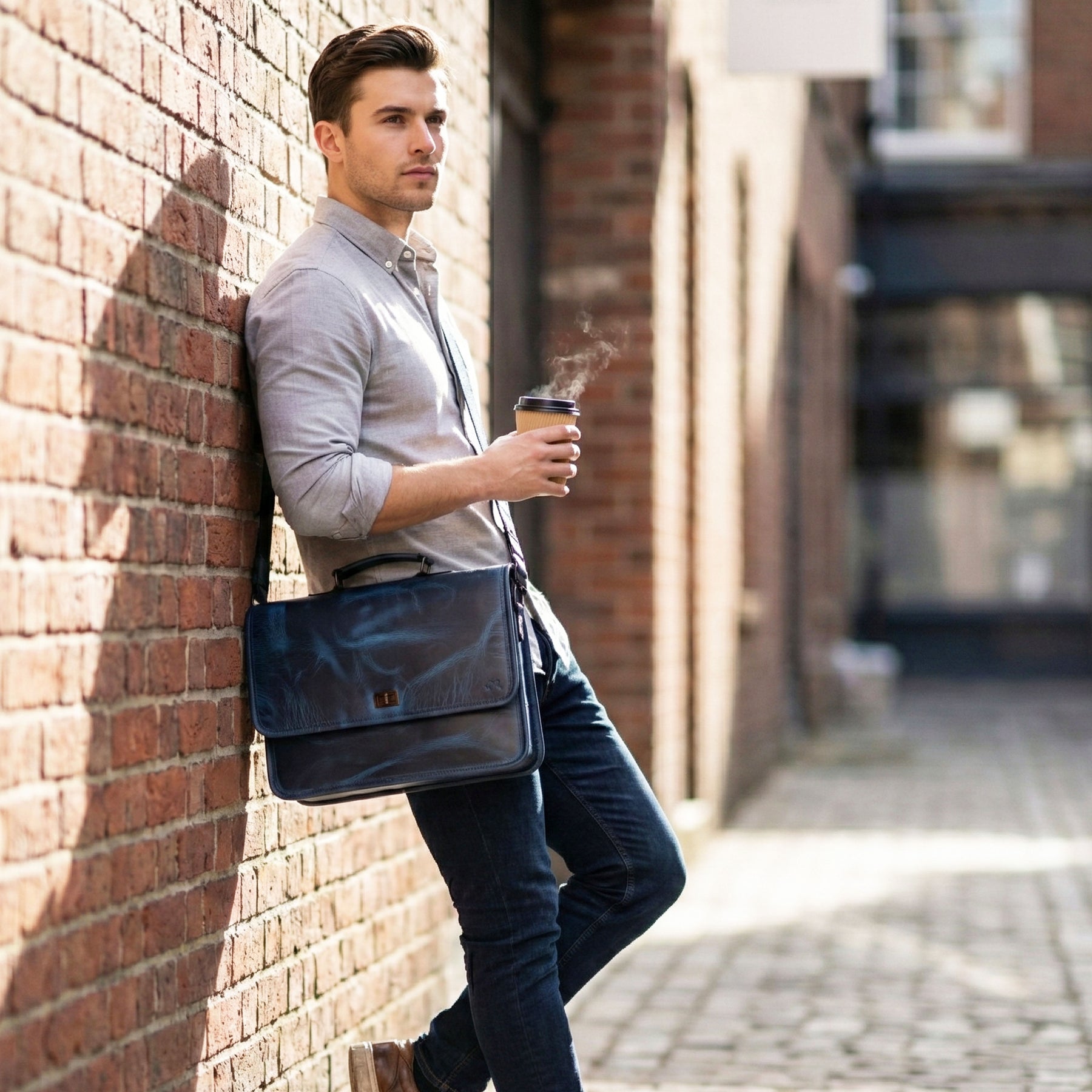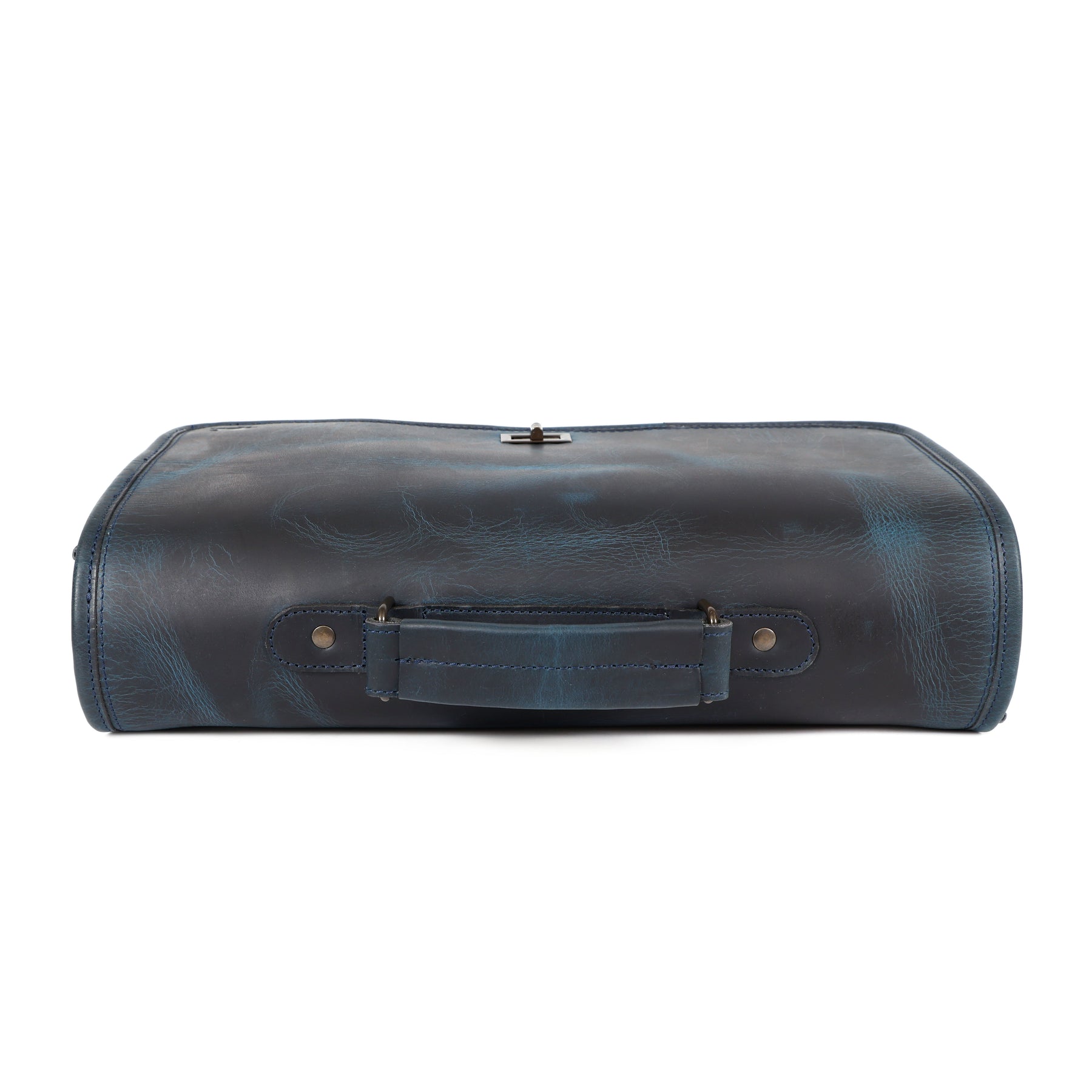 The Parker blue messenger bag showcases authentic full grain water buffalo leather in a rich blue finish. Each piece displays natural variations in tone and texture, a hallmark of genuine leather that ensures no two bags are identical. These subtle differences enhance the bag's character, revealing the material's organic beauty and craftsmanship while developing a distinctive patina with age.