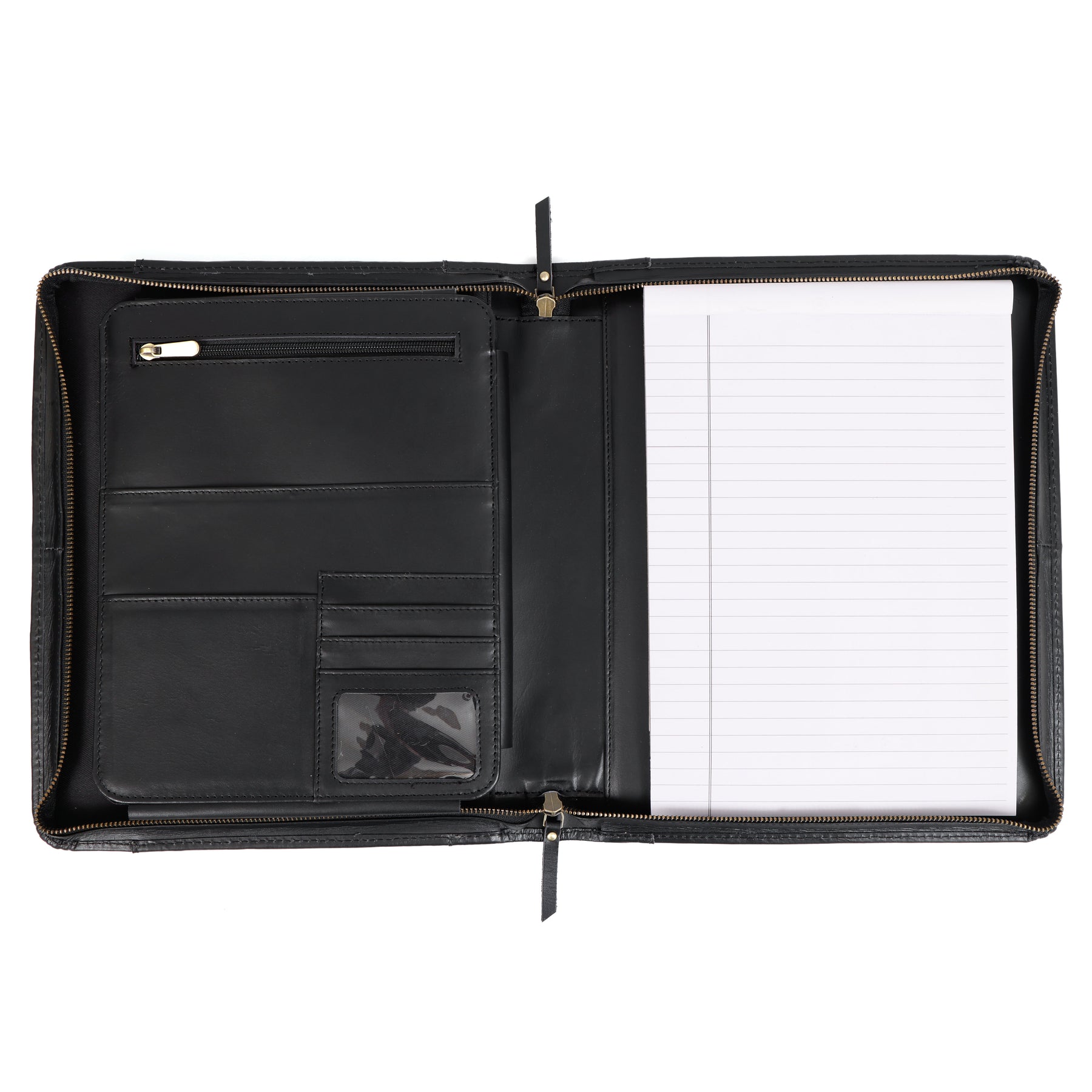 Experience luxury and organization with our full grain handmade black leather zippered padfolio. Keep all your essentials in one place with interior card slots, an ID window, pen holders, a zipper pocket, and a phone holder. Perfect for professionals on the go!