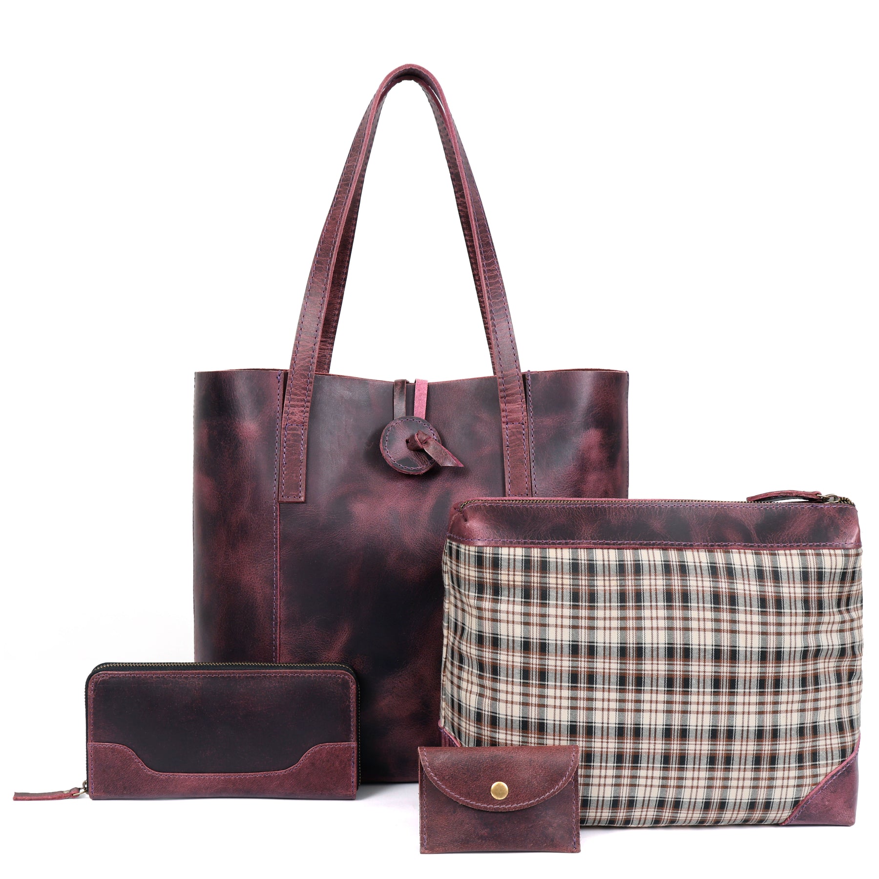The Lily Buffalo Leather Tote & Pouch Set includes a spacious tote, removable pouch, zip wallet, and snap wallet—all crafted from premium full-grain buffalo leather. The leather naturally ages into a rich patina, becoming more beautiful with use. Durable, timeless, and built to last through years of daily adventures.